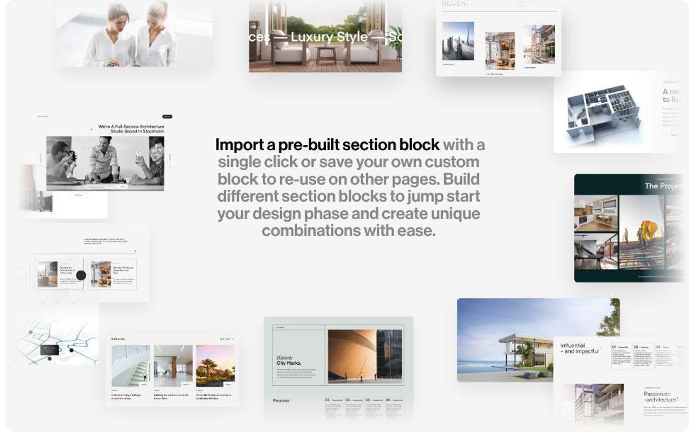 Import a pre-built section block with a single click or save your own custom block to re-use on other pages. Build different section blocks to jump start your design phase and create unique combinations with ease.
